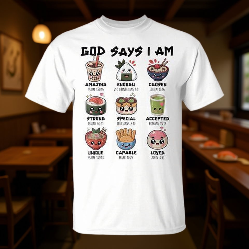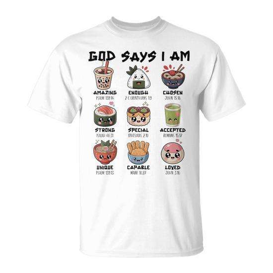 Maglietta cristiana con stampa 'God Says I Am Japanese Foods Sushi Ramen Matcha'