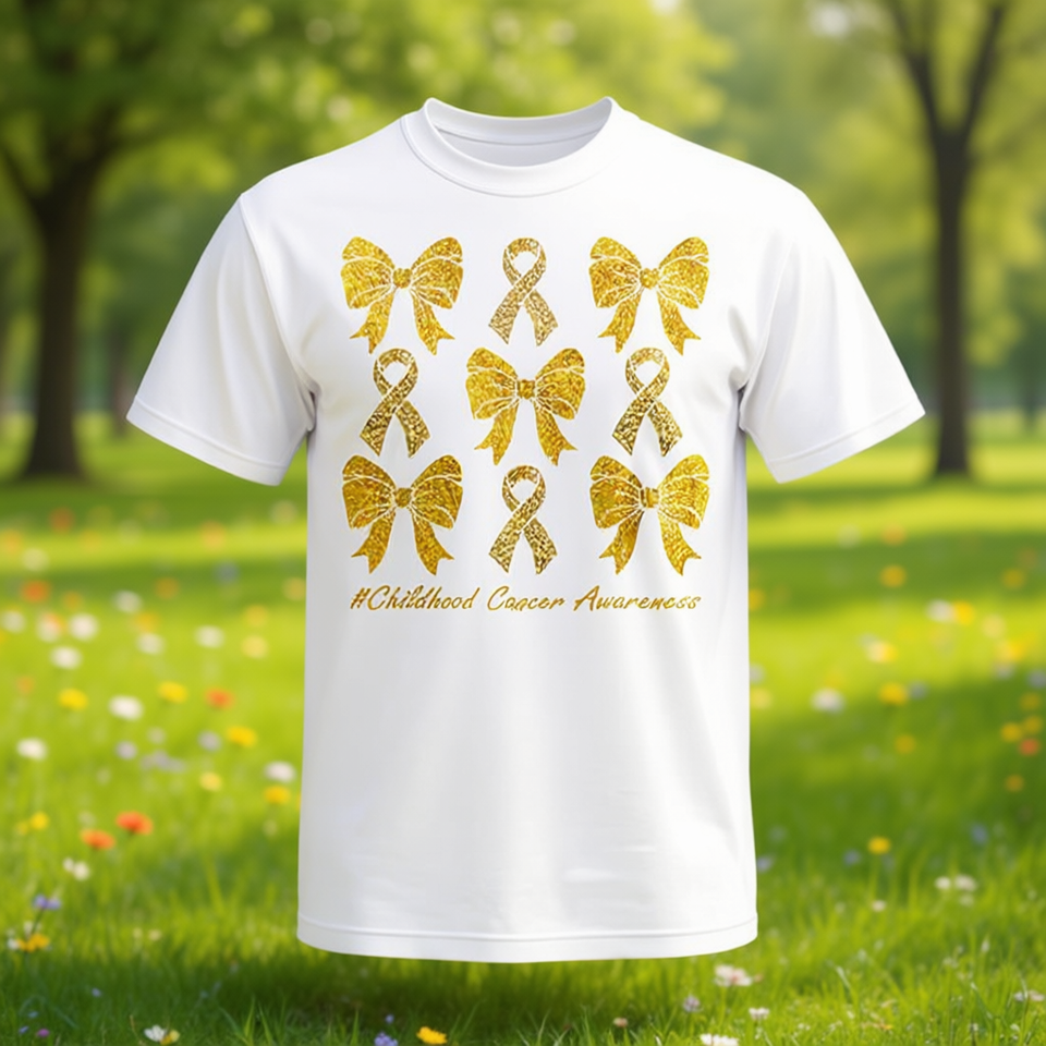 T-shirt Gold Bow per la sensibilizzazione sul cancro infantile per donne e ragazze