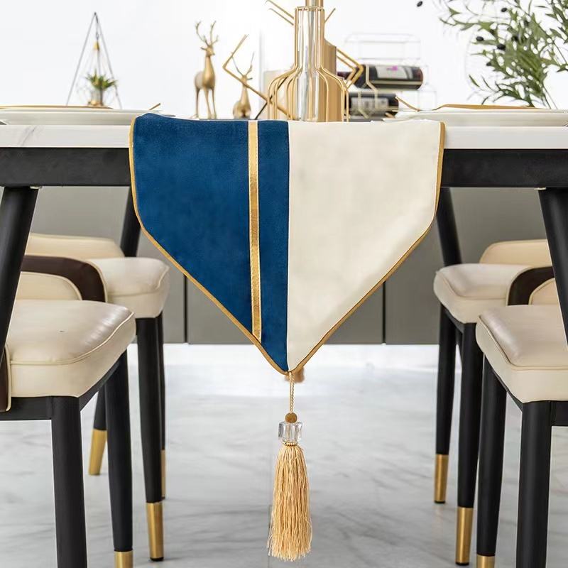 Gold Foil Sequence Blue Velvet Table Runners Restaurant Gold Boder in White Table Runner