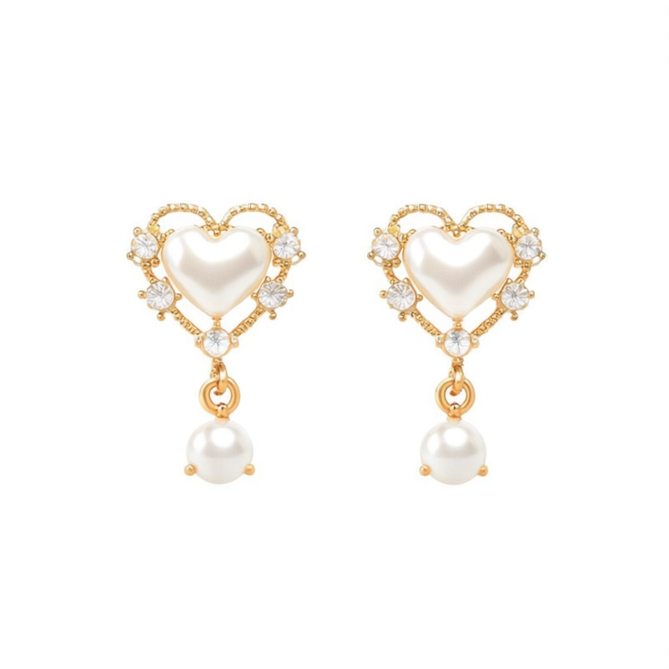 Gold Heart Shape Stud Earrings With Faux Pearl Drop For Women Wedding Jewelry Cute Design Zinc Alloy Gold Plated