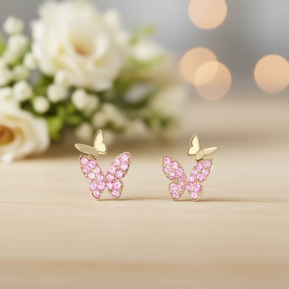 Gold Plated Butterfly Stud Earrings With Pink Rhinestones For Women Cute Fashion Jewelry Gift