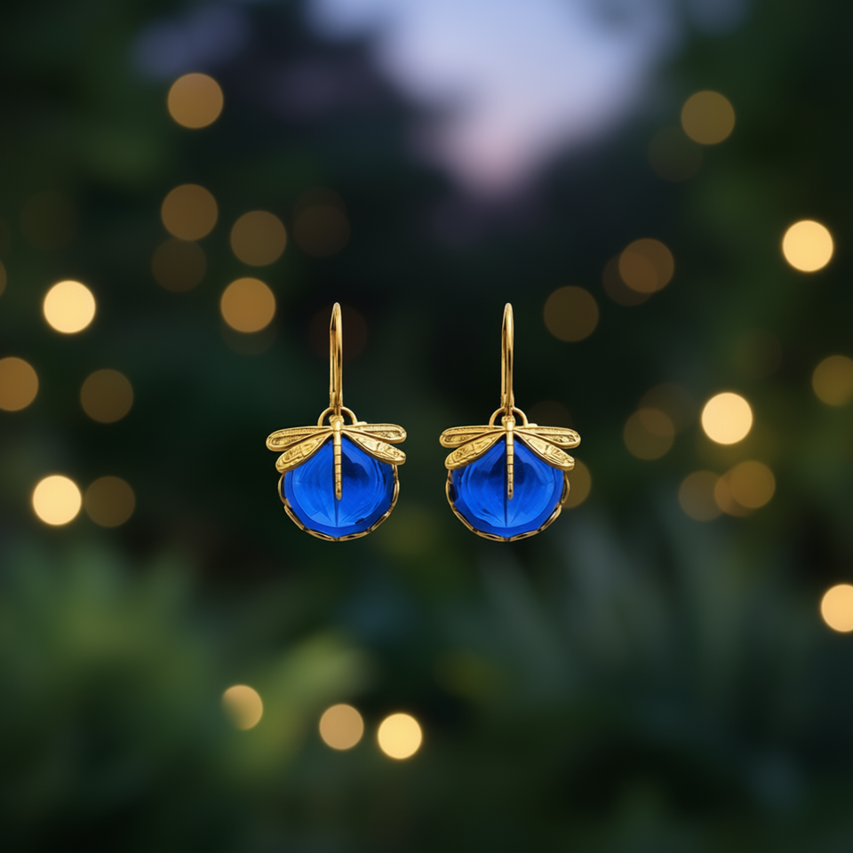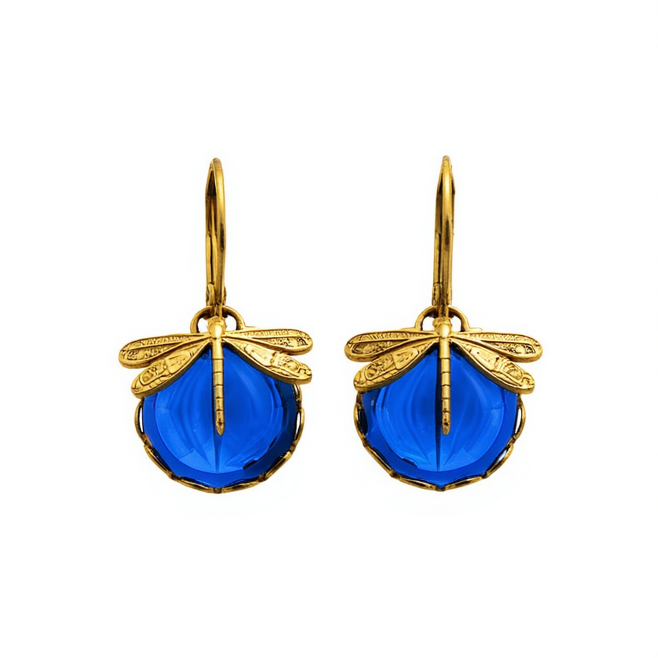 Gold Plated Dragonfly Drop Earrings With Blue Crystal Rhinestone Bezel Setting Vintage Style For Women Party Jewelry