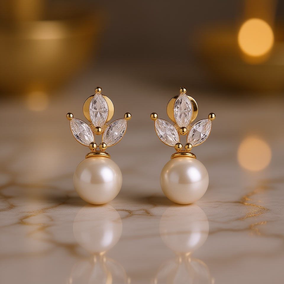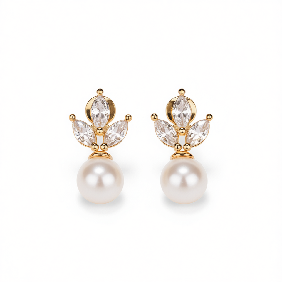 Orecchini a perno placcati oro con perle e design floreale in cristallo taglio marquise per donna, gioielli classici raffinati da matrimonio