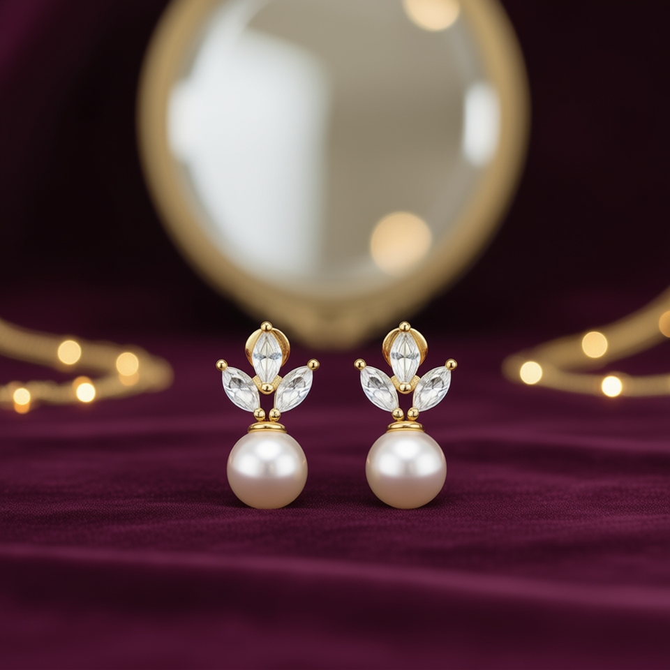 Gold Plated Pearl Stud Earrings With Marquise Cut Crystals Flower Design For Women Wedding Fashion Jewelry