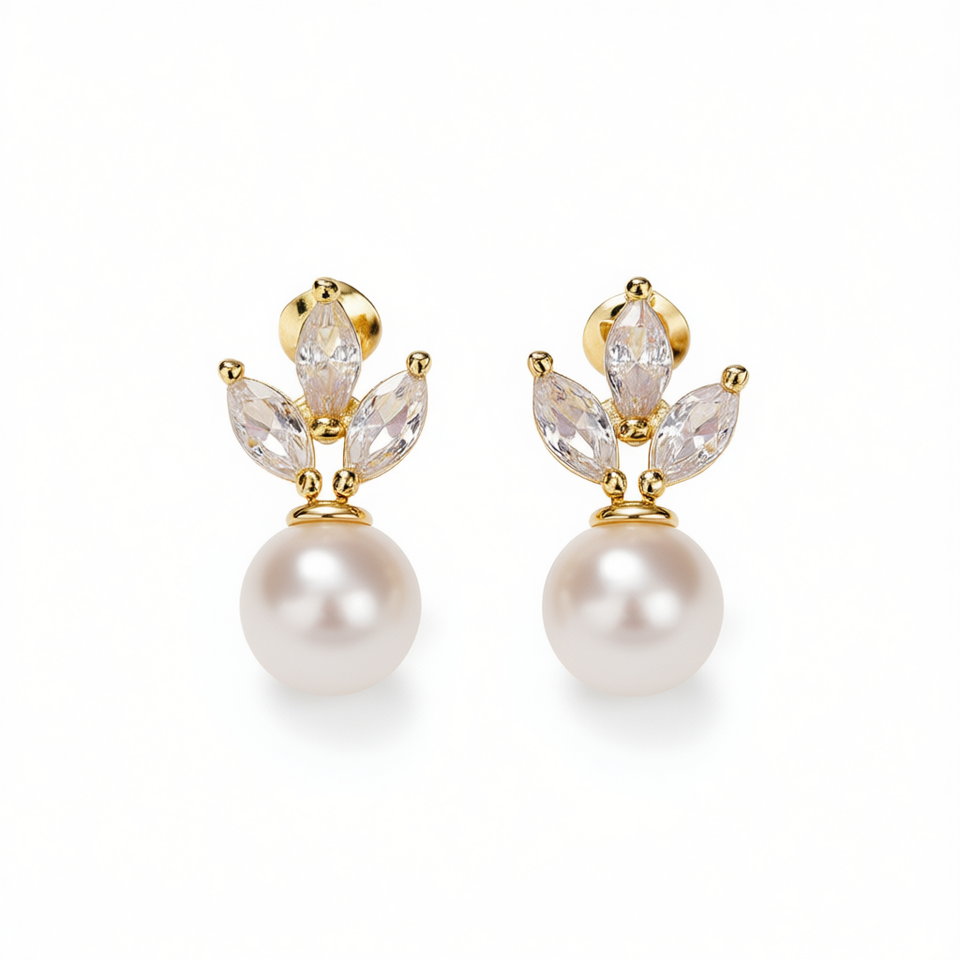 Gold Plated Pearl Stud Earrings With Marquise Cut Crystals Flower Design For Women Party Fashion Jewelry