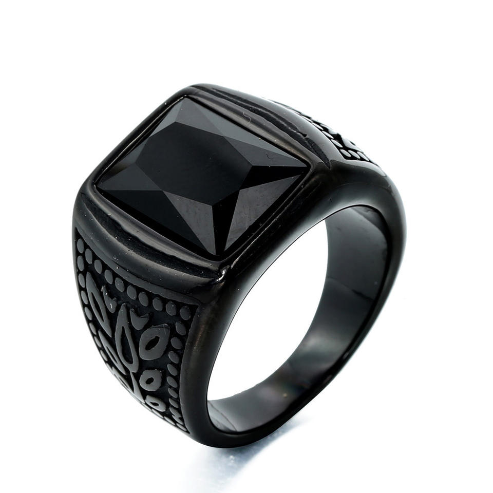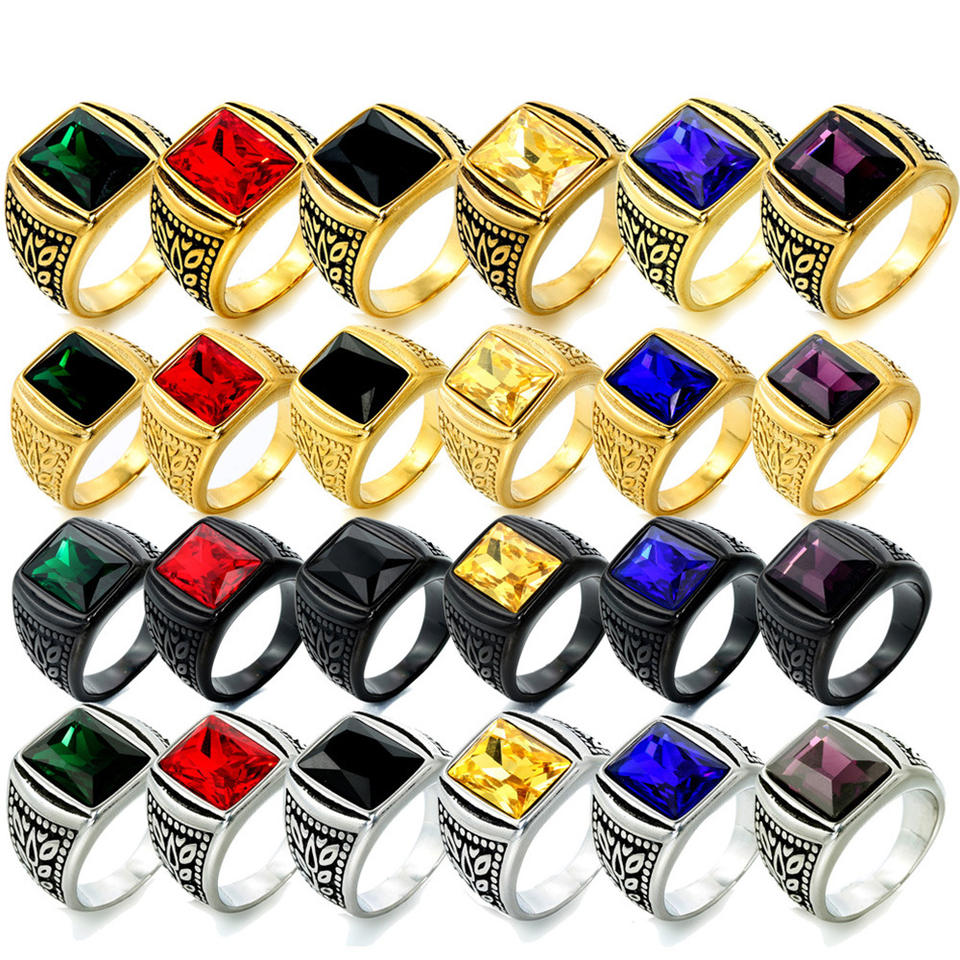 Anello Placcato Oro Classico con Pietra Preziosa Colori Rubino Zaffiro Smeraldo Pietra Nera Incisione Ornata Stile Audace per Uomo