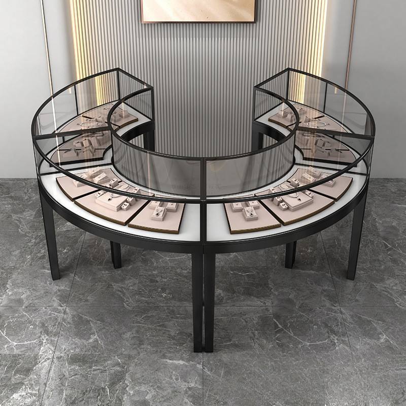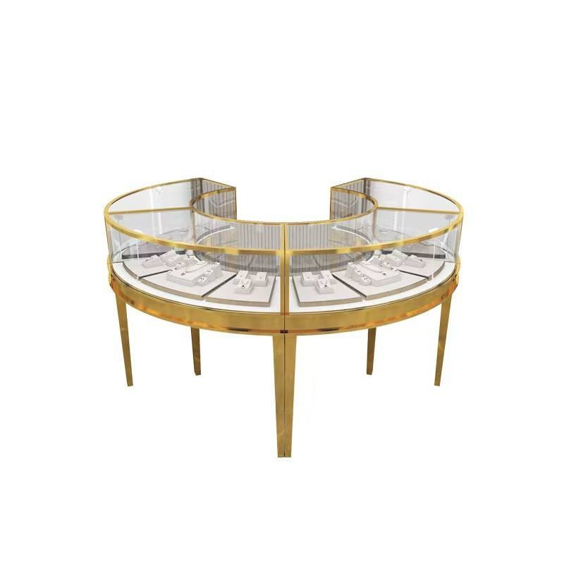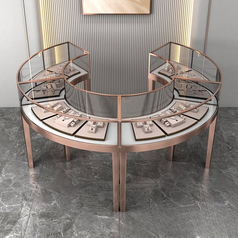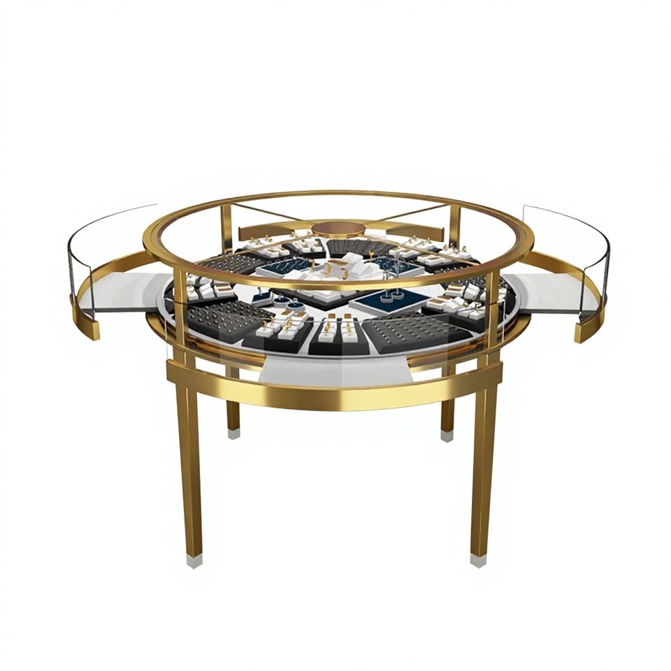 Vetrina Espositiva Rotonda Oro e Bianca per Gioielli e Cosmetici con Porte in Vetro e Illuminazione LED, Robusta per Esposizioni Aziendali