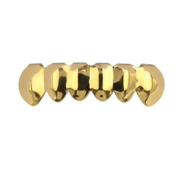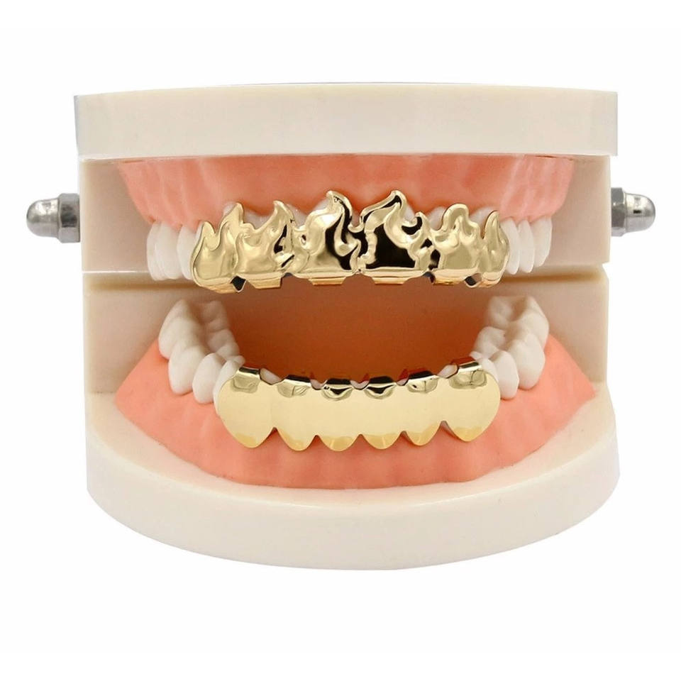 Set di grill superiore e inferiore in foglia di fiamma placcato color oro