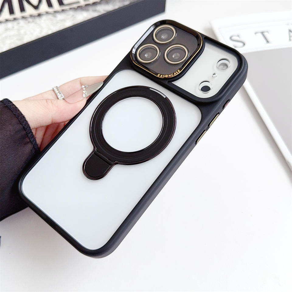 Custodia per Telefono con Supporto in Metallo Placcato Oro, Lente Protettiva Completa, Trasparente con Chiusura Magnetica per iPhone 12 13 14 15 16 17 Pro Max