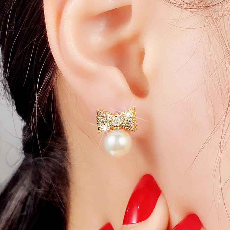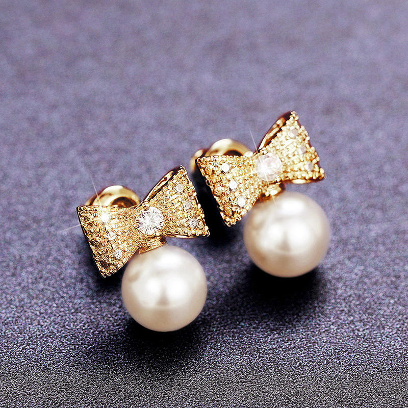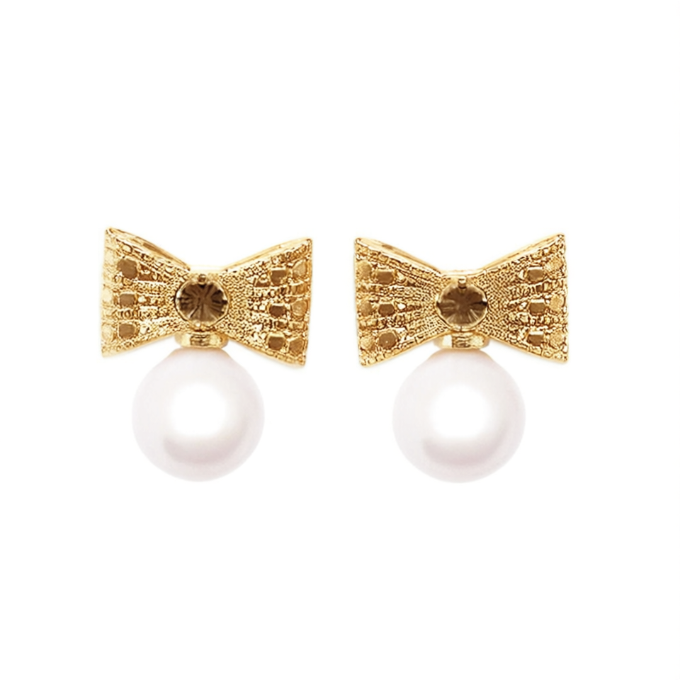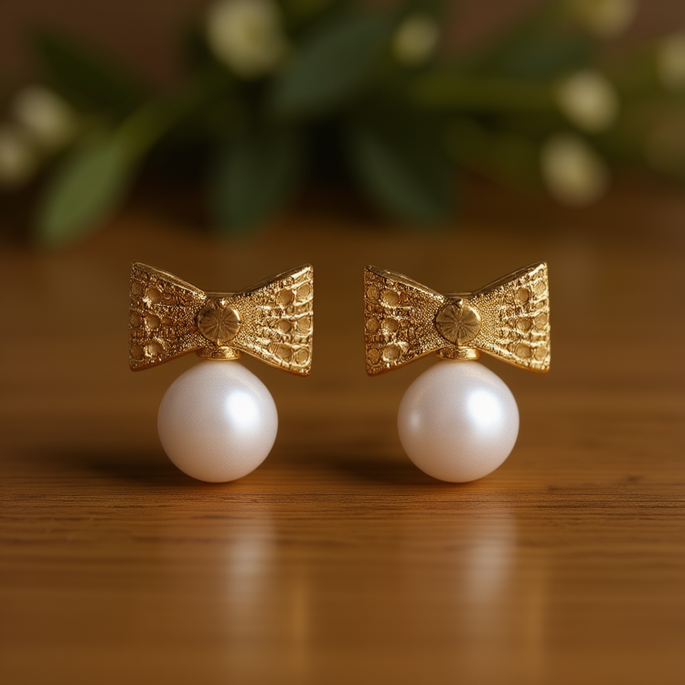 Golden Bowknot Stud Earrings With Freshwater Pearl Bezel Setting For Women Everyday Wear