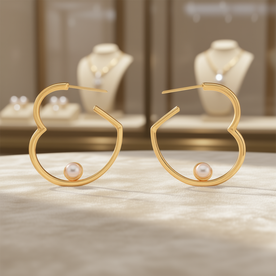 Orecchini a Cerchio con Cuore Dorato e Perla Coltivata Bianca, Design Minimalista per Uso Quotidiano Femminile, Placcati in Oro 18K
