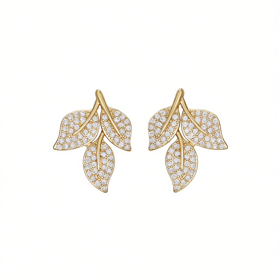 Golden Leaf Stud Earrings With Crystal Rhinestones Micro Pave For Women Party Romantic Fashion Jewelry