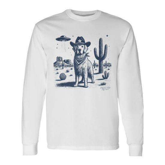 T-shirt a maniche lunghe con cappello da cowboy Golden Retriever e scena del deserto UFO