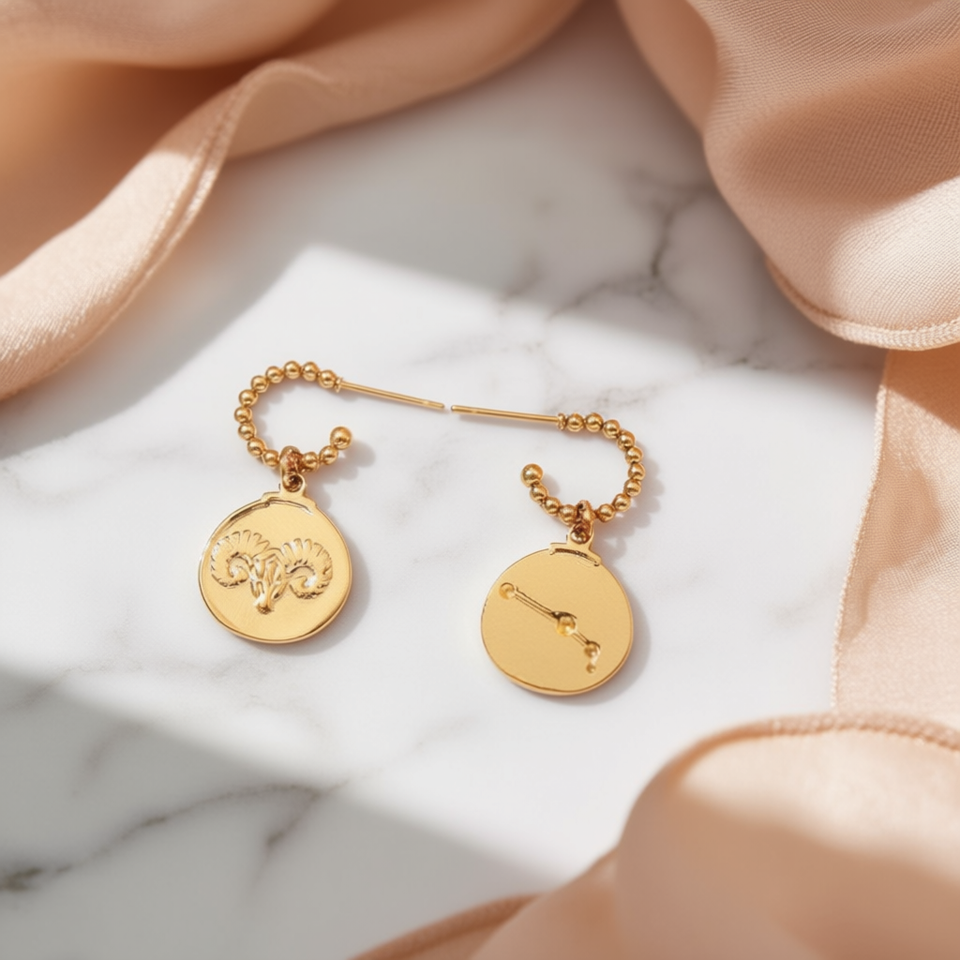 Orecchini a perno con ciondolo a forma di Ariete dello zodiaco dorato, con catena, 12 mm, in acciaio 12