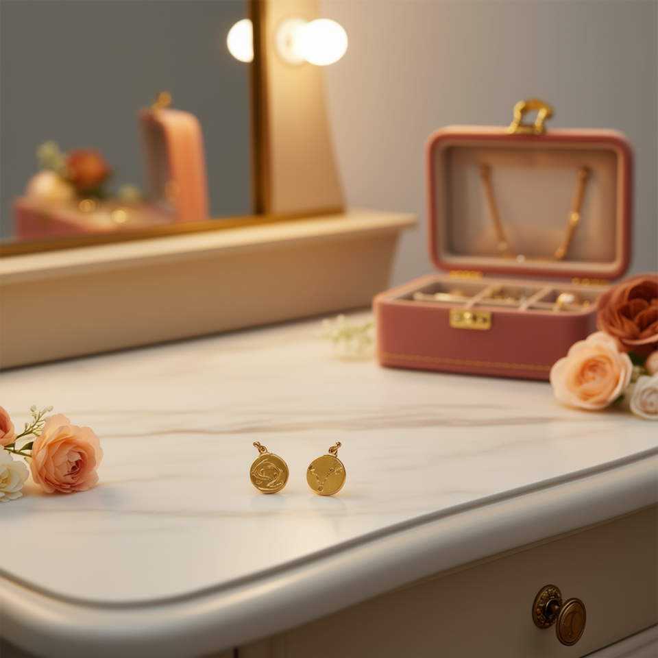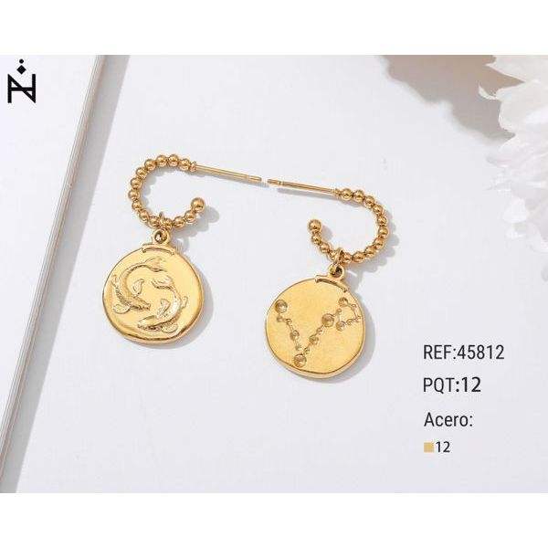 Orecchini a Perno con Segno Zodiacale Dorato e Ciondolo a Catena Acero 12 Ref45812