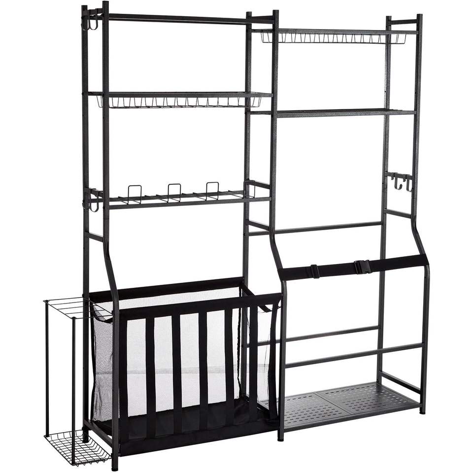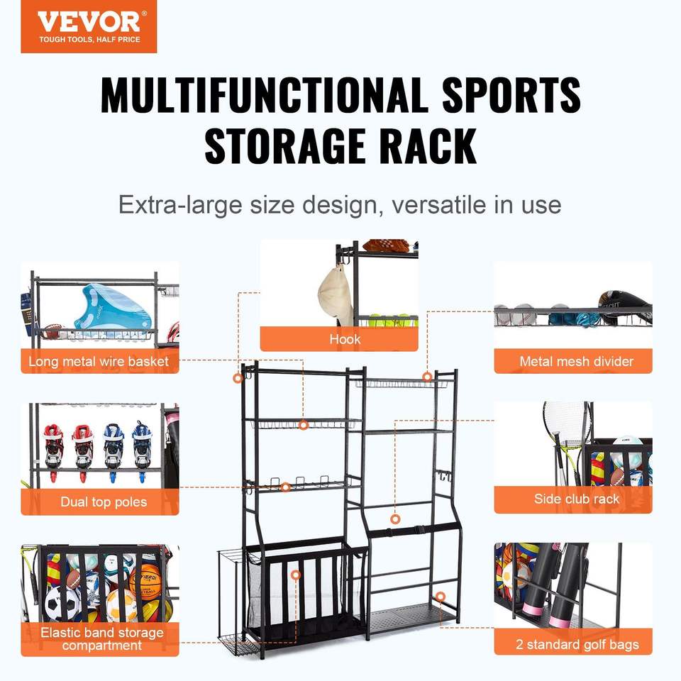 Golf Rack Storage Organizer 2 Bag Stand Holder with Sports Gear Toys Storage Baskets and Hooks Outdoor Steel Ball Cart Black