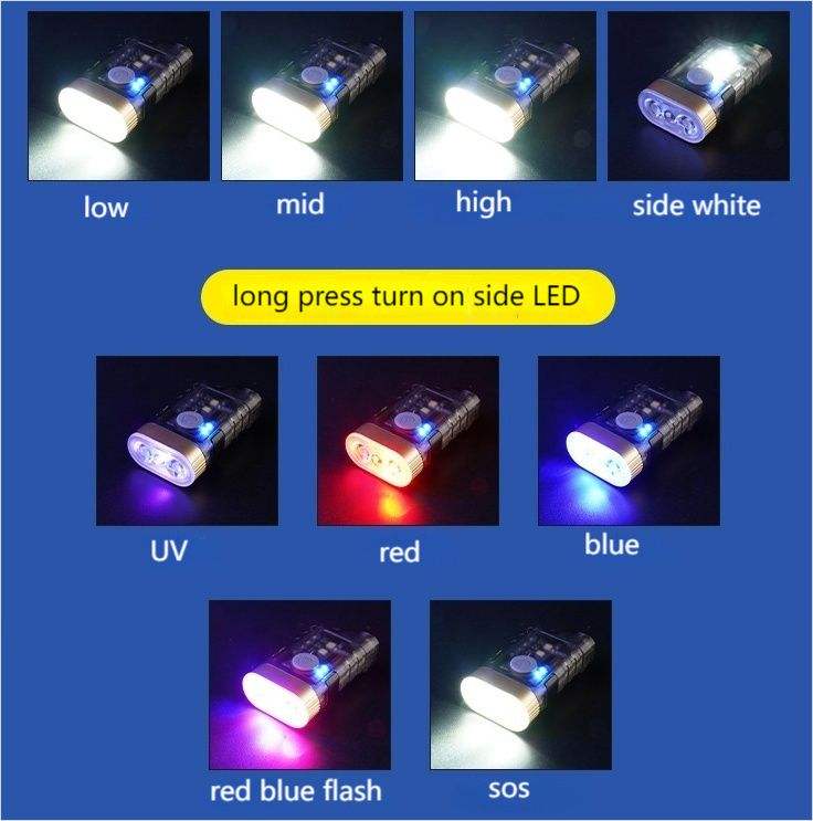 Torcia LED di Alta Qualità in ABS con 4 Colori di Luce, Mini Torcia UV con Portachiavi, Design con Clip Magnetica, Ricaricabile, Torcia EDC