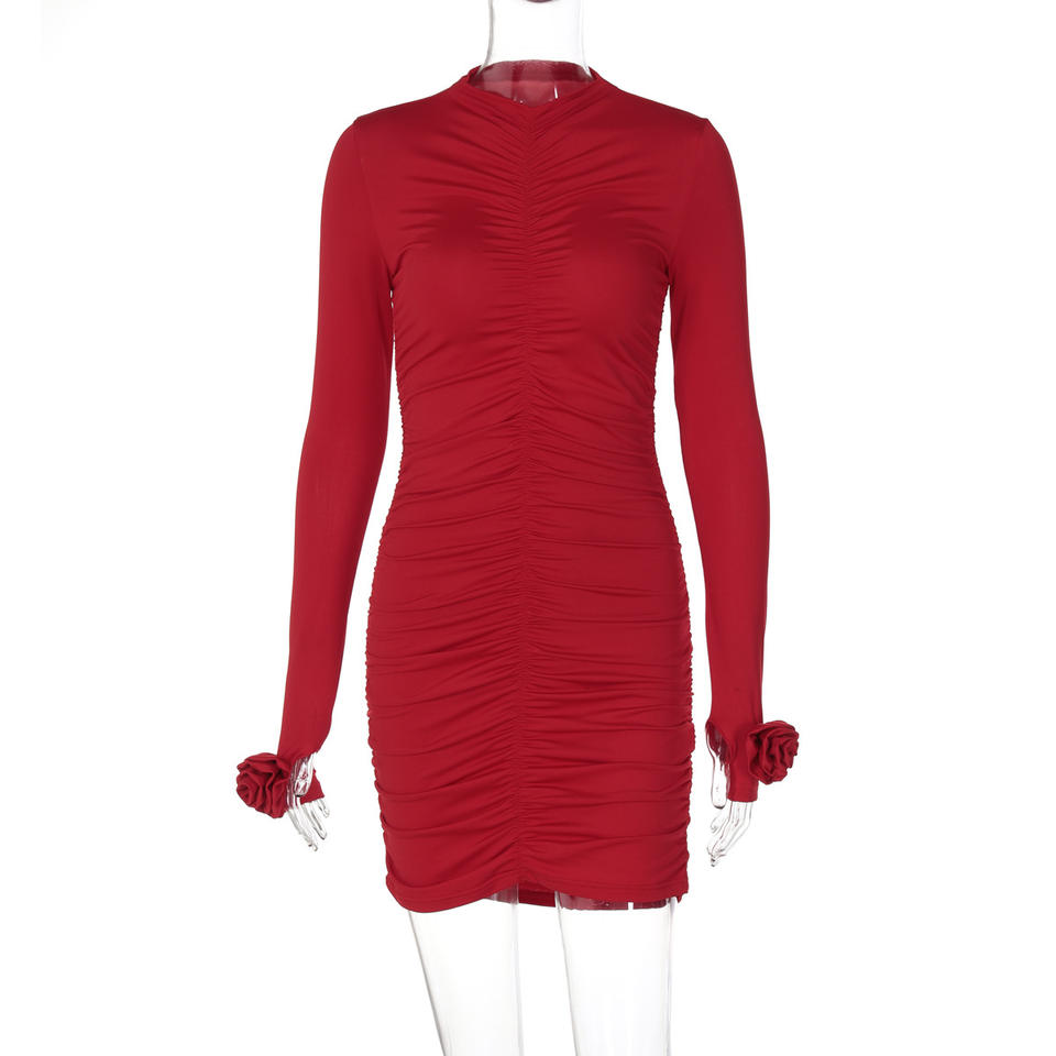 Good Stretchy Bodycon Long Sleeve Black Bodycon Mini Dress Ruffled Pleated Red Sexy Dress for Women Party Club Night