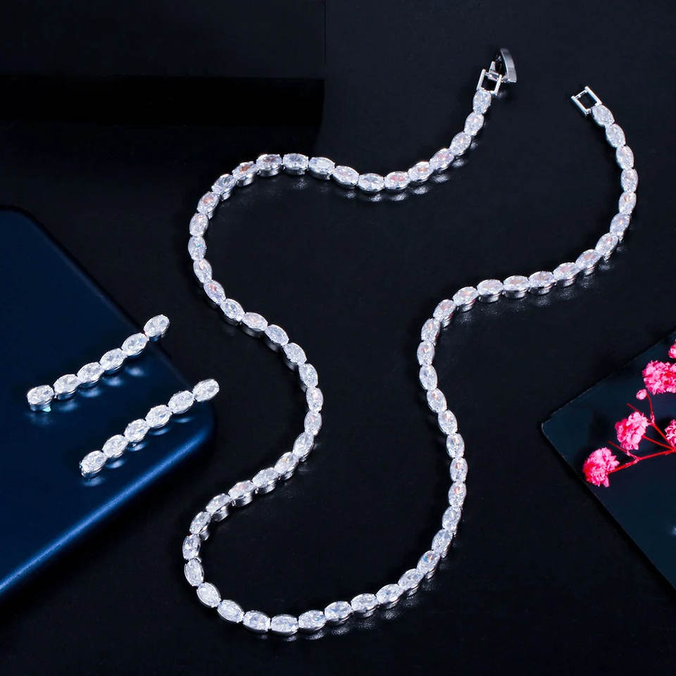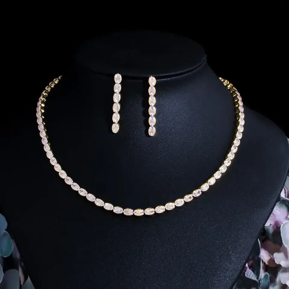 Splendidi set di gioielli da sposa e di alta gioielleria, collana e orecchini con zirconi cubici a forma ovale placcati oro