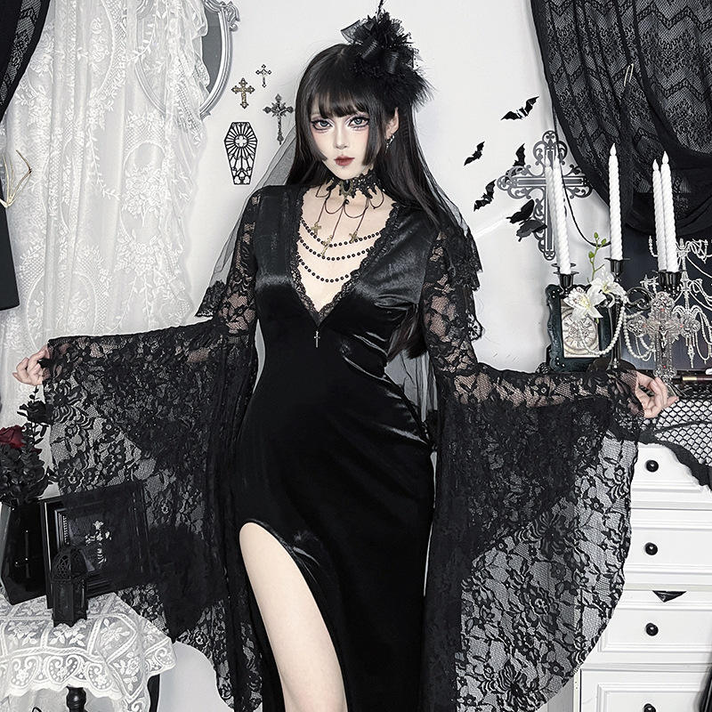 Abbigliamento gotico abito Slim da donna con colletto V e maniche svasate in pizzo nuovo abito lungo nero