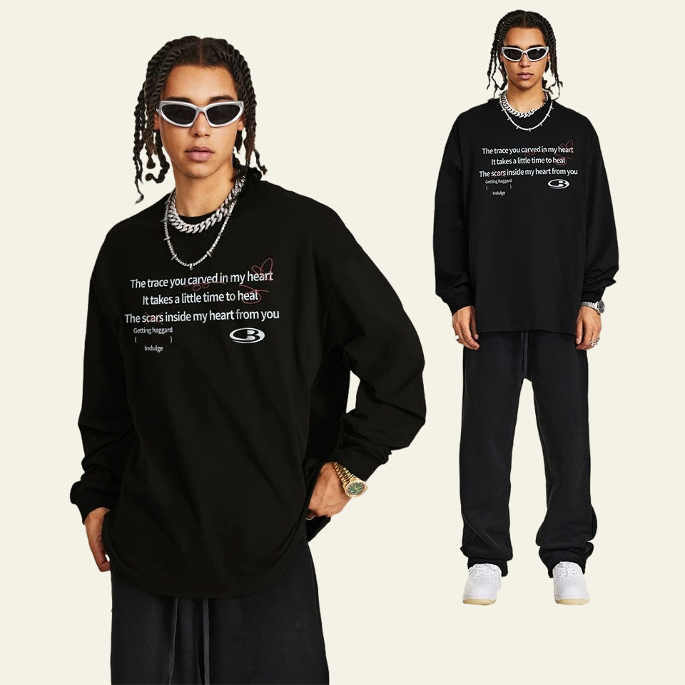 T-shirt da Uomo Oversize con Stampa Grafica Gotica, Manica Lunga, Cotone Pesante 300g, Effetto Invecchiato, Nero e Bianco, Stile Streetwear