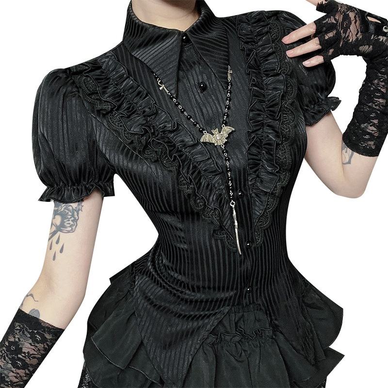 Camicetta Gotica Lolita Nera in Pizzo con Volant e Maniche Regolari, con Collana Pendente a Pipistrello - Camicia Estiva Corta Slim Fit all'Ingrosso