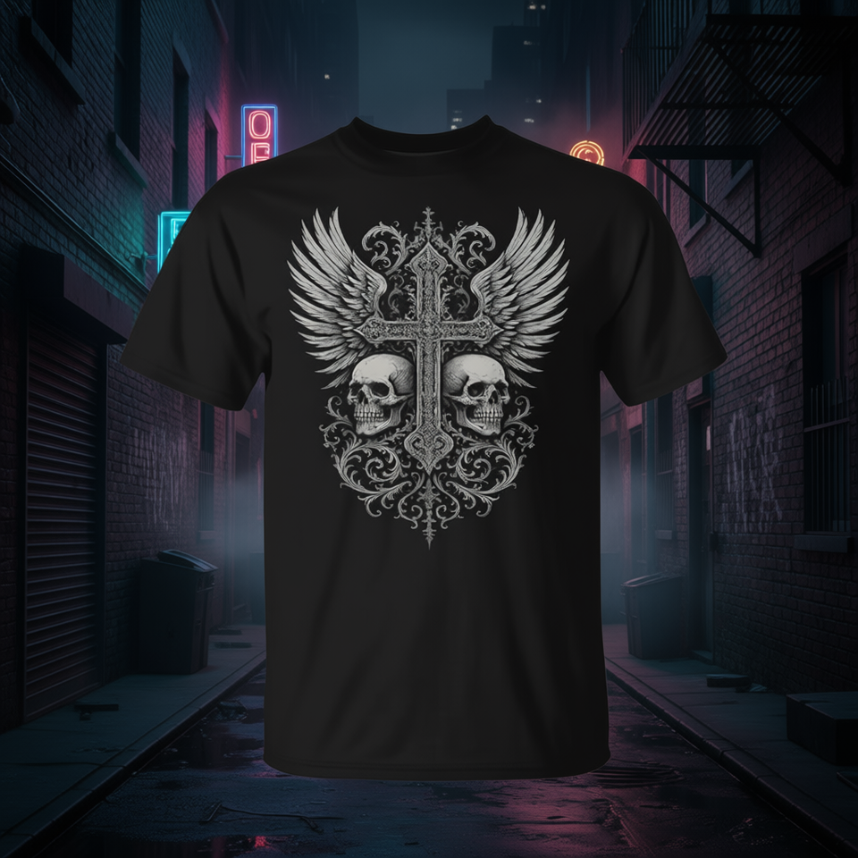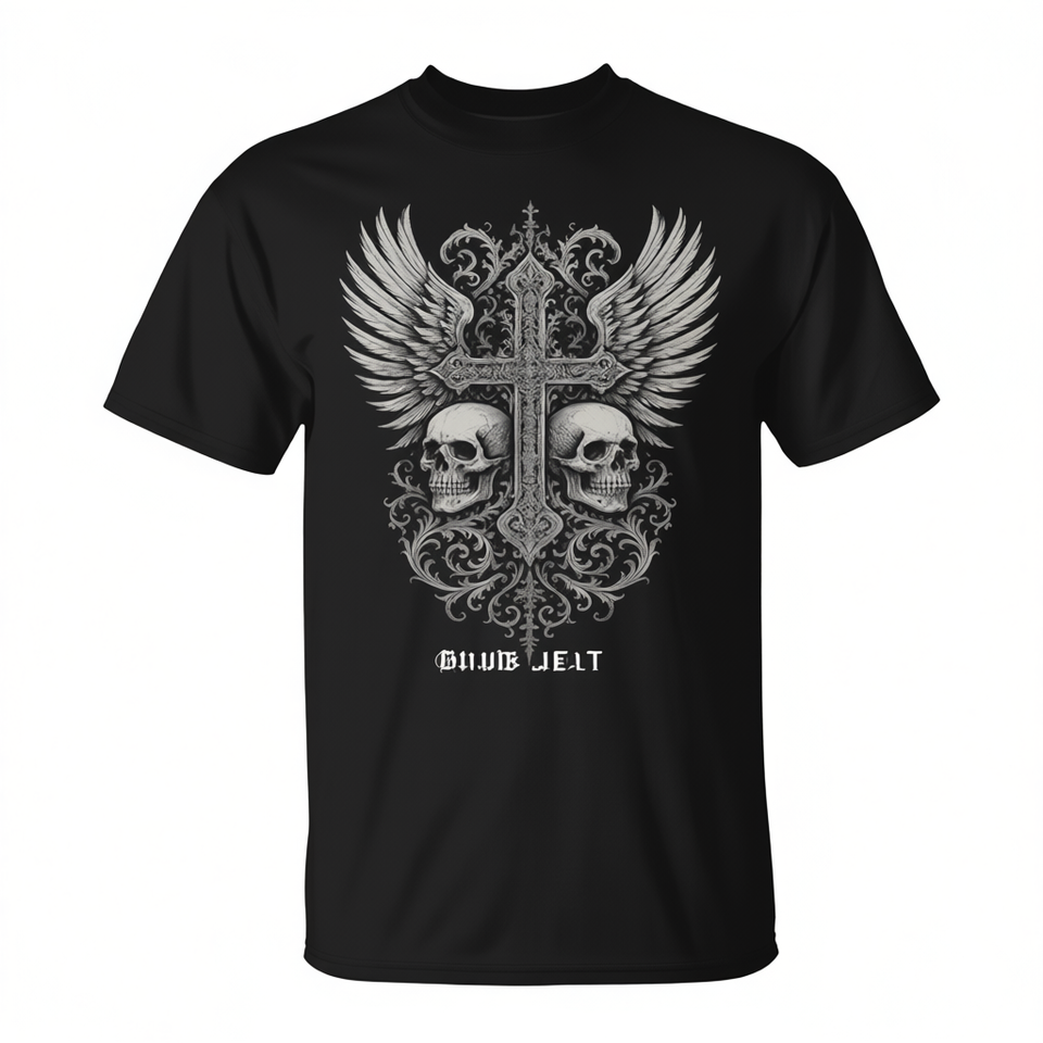 T-shirt Gothic Skull Cross Wings T-shirt nera con grafica da uomo, estetica gotica