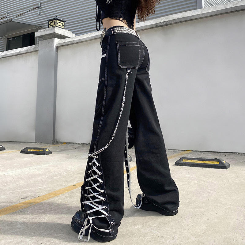 Gothic Women Baggy Jean Aesthetic Lace up Patchwork Dark Academia Streetwear Punk Bandage Denim Trousers Straight Pants