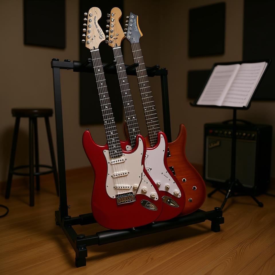 Supporto per chitarre Grack 3N1, 3 slot, pieghevole, in metallo, da pavimento, per chitarre elettriche e acustiche, supporto triplo per esposizione e conservazione.