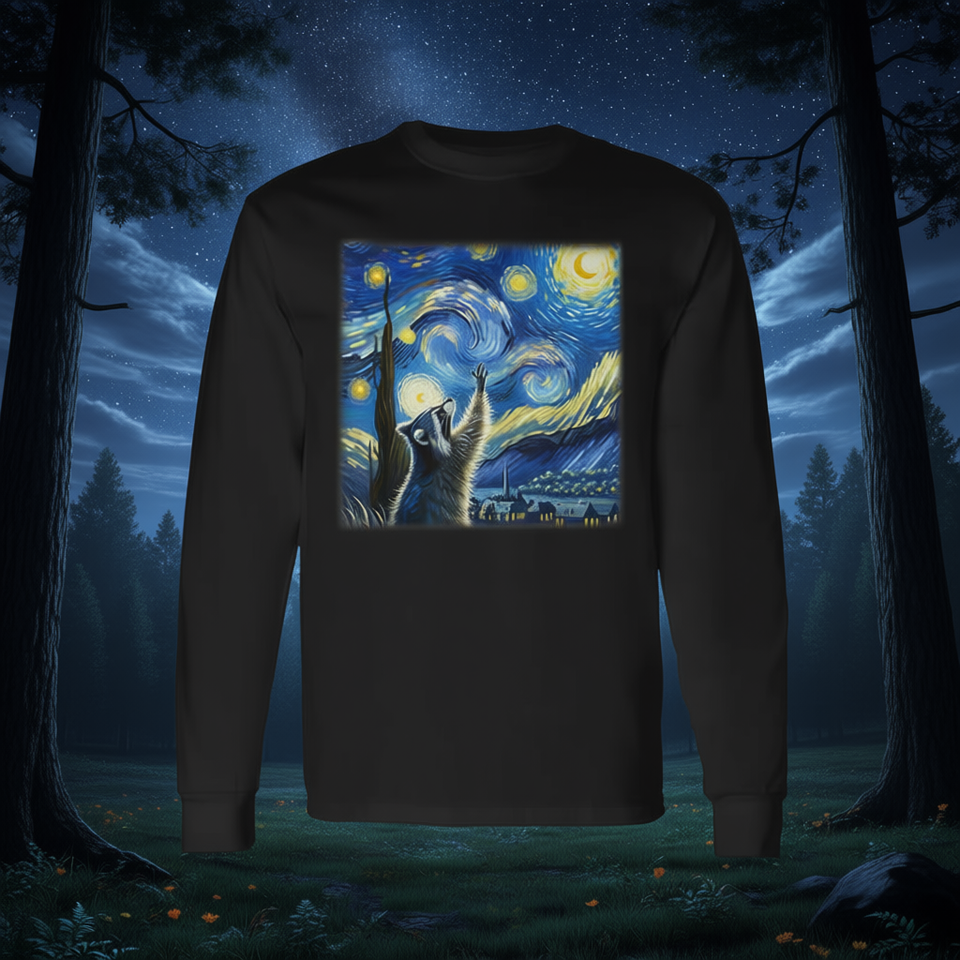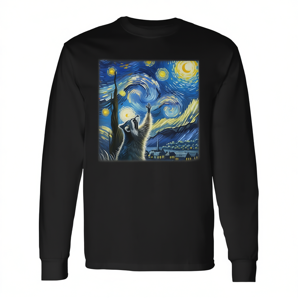 T-shirt a maniche lunghe con grafica Raccoon Starry Night, design artistico, abbigliamento unisex