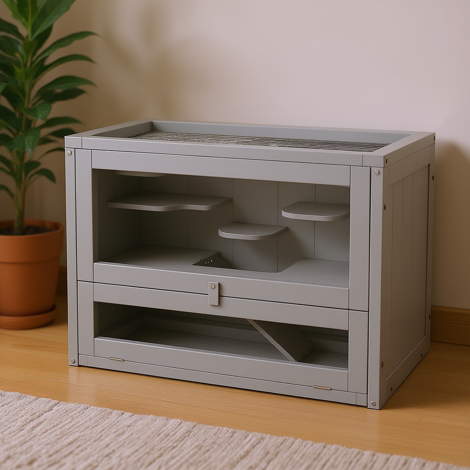 Gabbia per criceti a 2 livelli grigia con parte superiore apribile, in plastica, con ripiano e scaletta per piccoli animali domestici