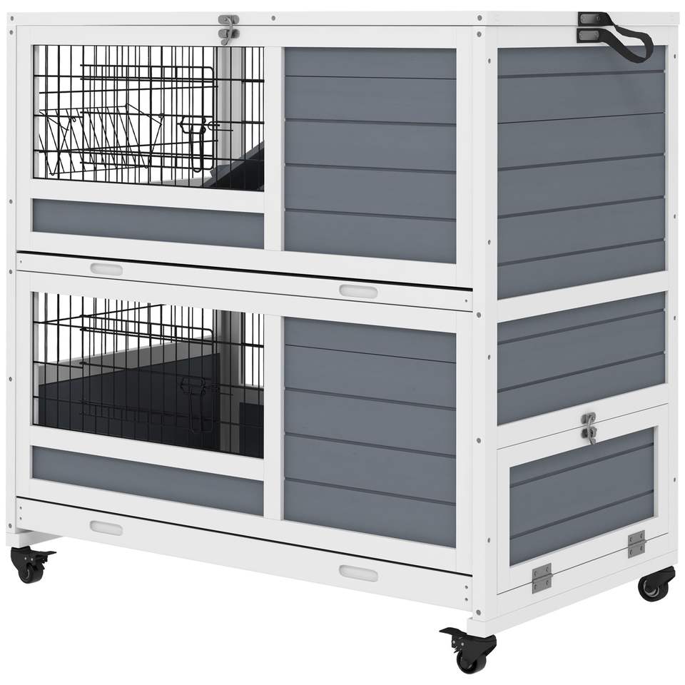 Gray 2-Tier Indoor Rabbit Hutch with Wheels Feeding Trough Small Animal Supplies Comfortable Bunny House for Your Furry Friends