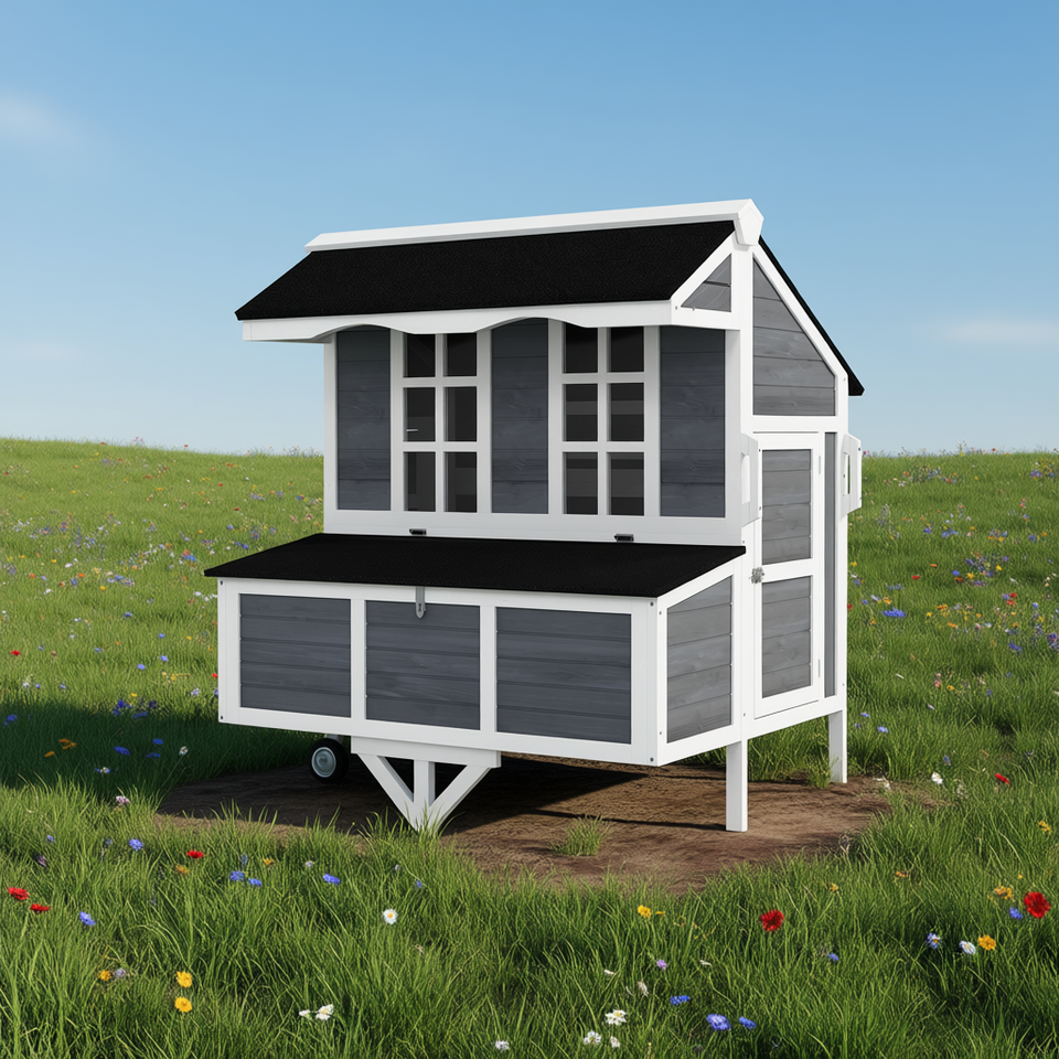 Nuovo Pollaio Grigio in Legno con Ruote, 43 Pollici, Nido, Finestre, Vassoio Estraibile, Posatoi per 2-4 Galline, Trasportabile