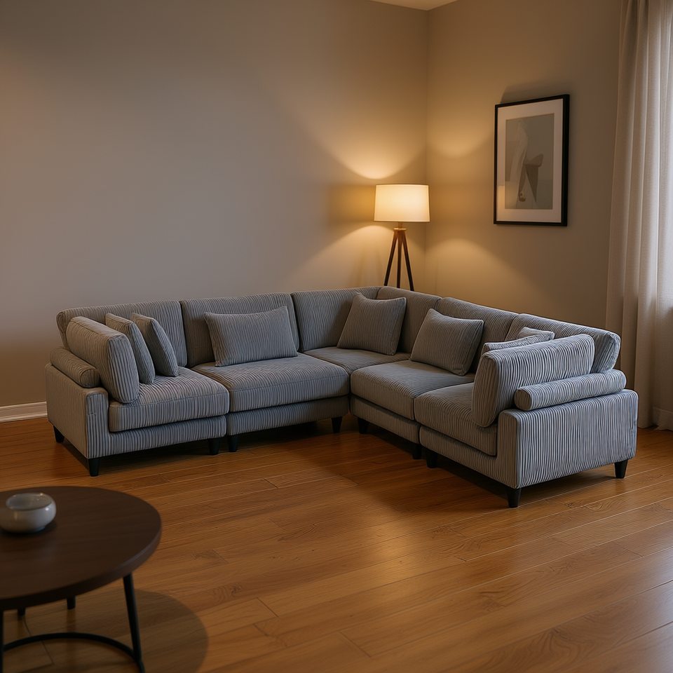 Divano componibile a L in velluto a coste grigio per soggiorno con cuscini morbidi e sedie senza braccioli