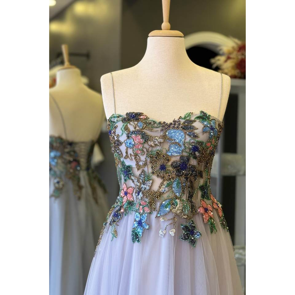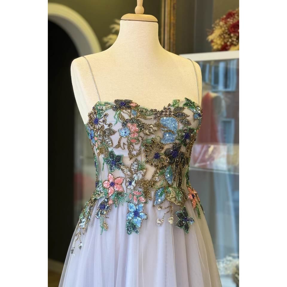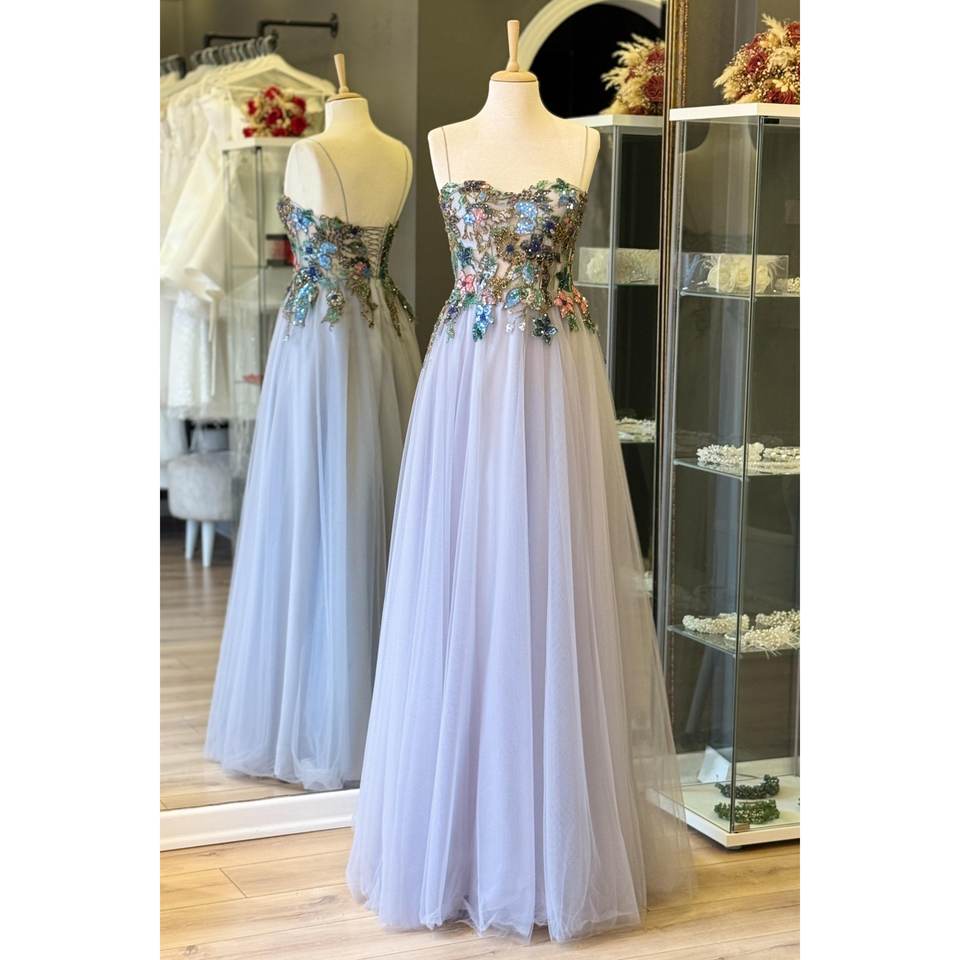 Gray Embroidered Lace Overlay Evening Dress Transparent and Stylish for Night Events