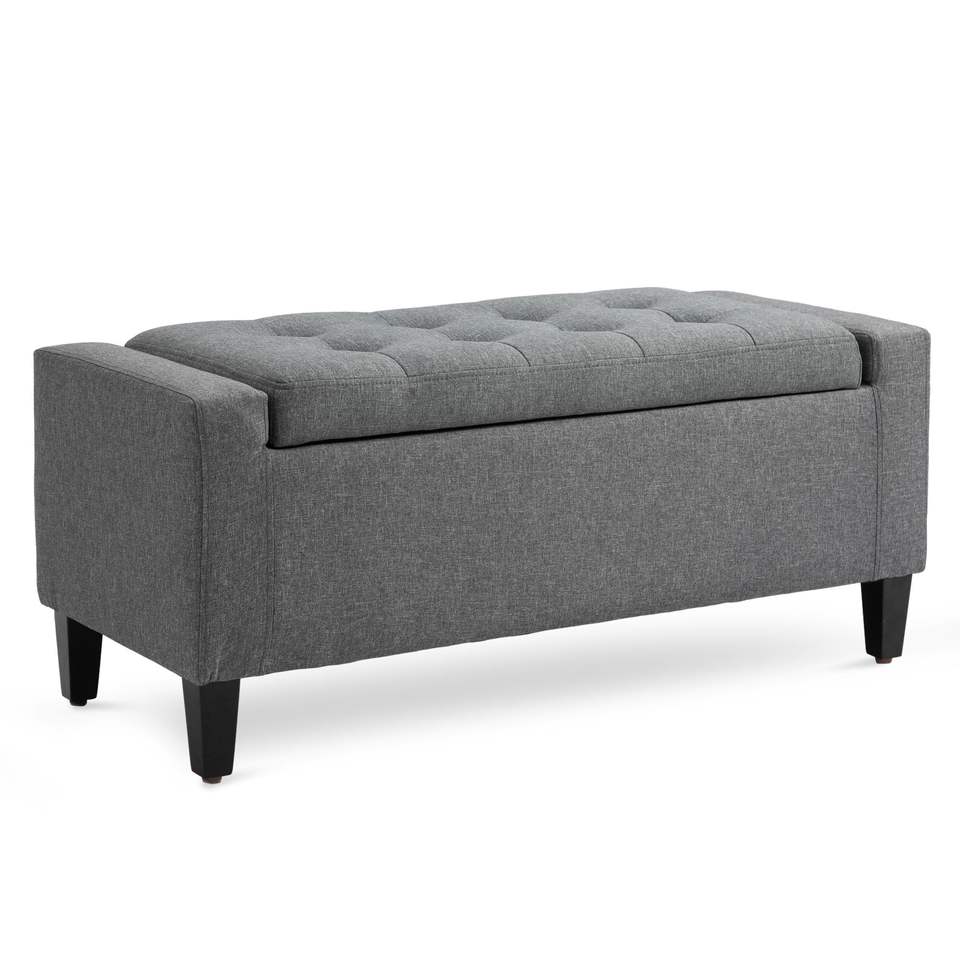 Pouf contenitore salvaspazio in lino grigio con coperchio sollevabile e design salvaspazio