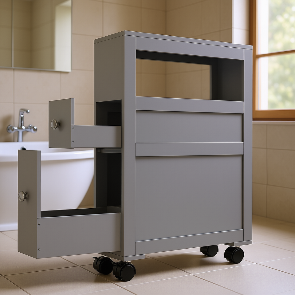 Gray Narrow Bathroom Storage Cabinet 18 In Width Rolling Wheels Drawers Space Saving Freestanding Shelf
