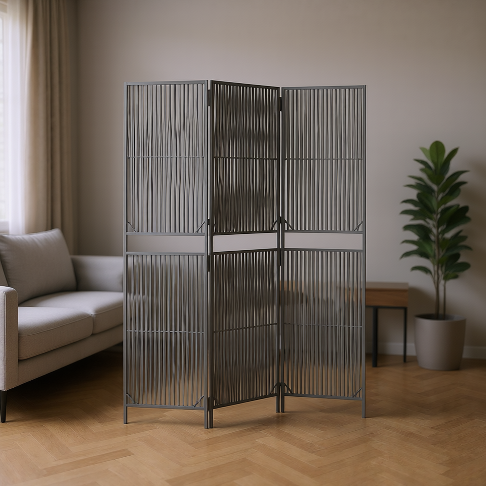 Divisorio per Stanza a 3 Pannelli in Polyrattan Grigio, Pieghevole, Design Moderno
