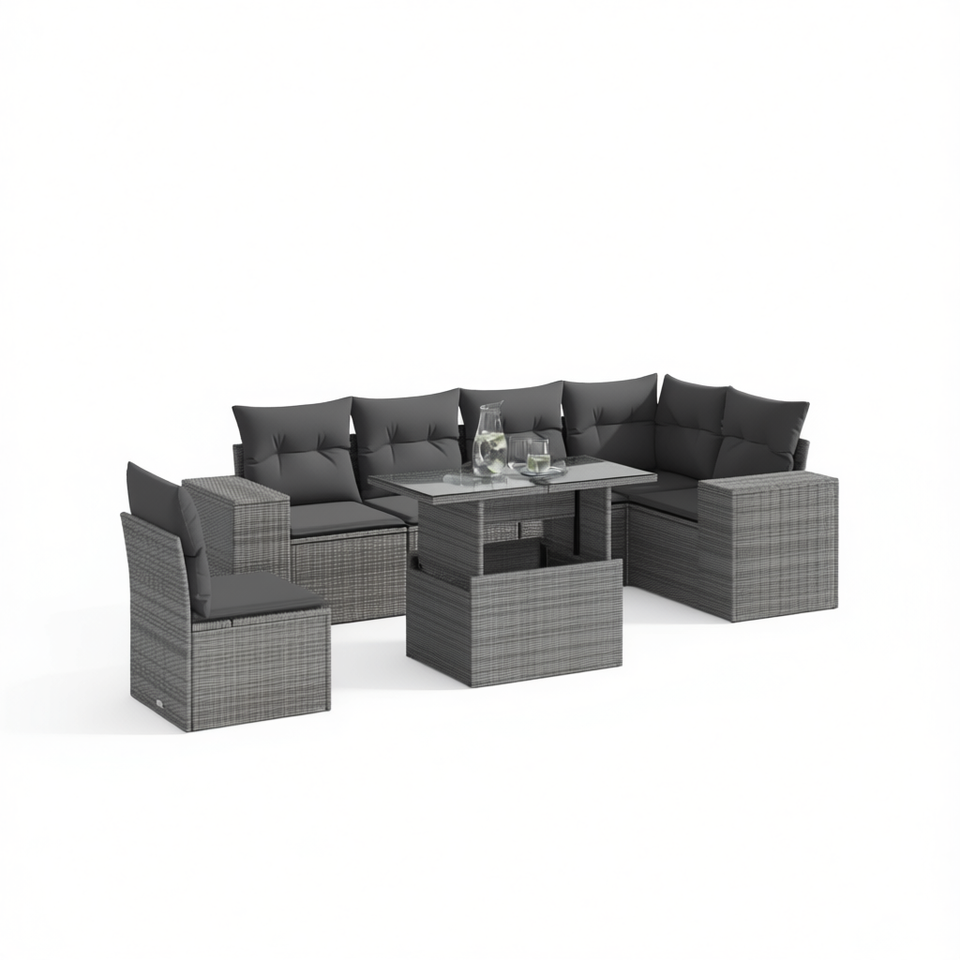 Set Divano da Giardino in Polyrattan Grigio con Telaio in Acciaio Verniciato a Polvere, Tavolo in Vetro Temperato, Arredamento da Esterno 6 Posti, Design Contemporaneo