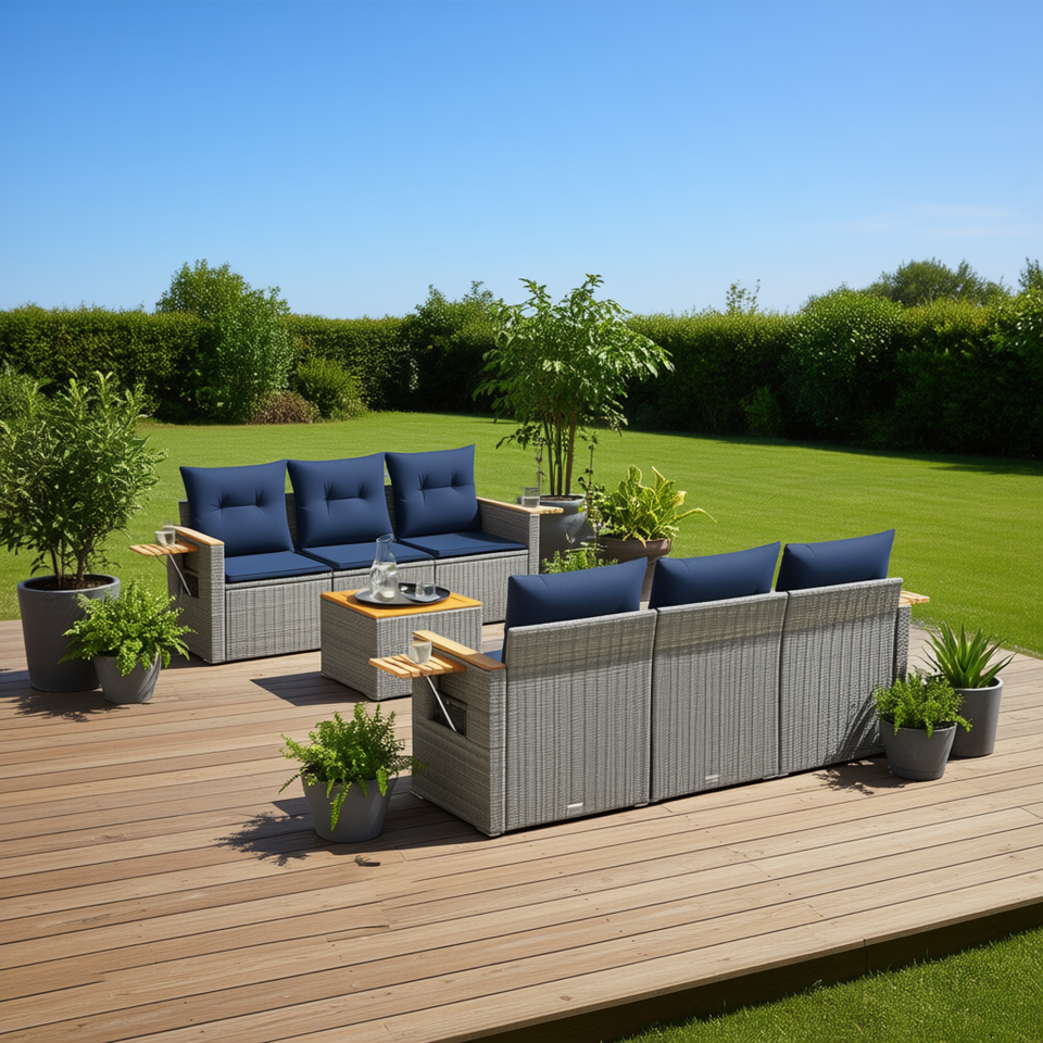 Set Divano da Esterno in Polyrattan Grigio con Cuscini, Arredamento da Giardino 7 Pezzi Modello D0100X3M44P