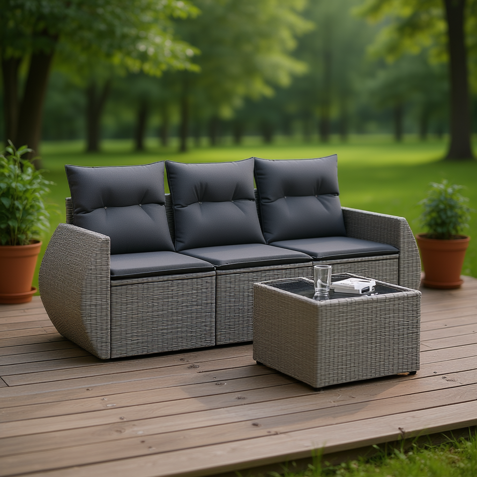Set Divano da Esterno in Polyrattan Grigio con Cuscini, Arredamento Durevole per Esterni, 3 Posti con Tavolino
