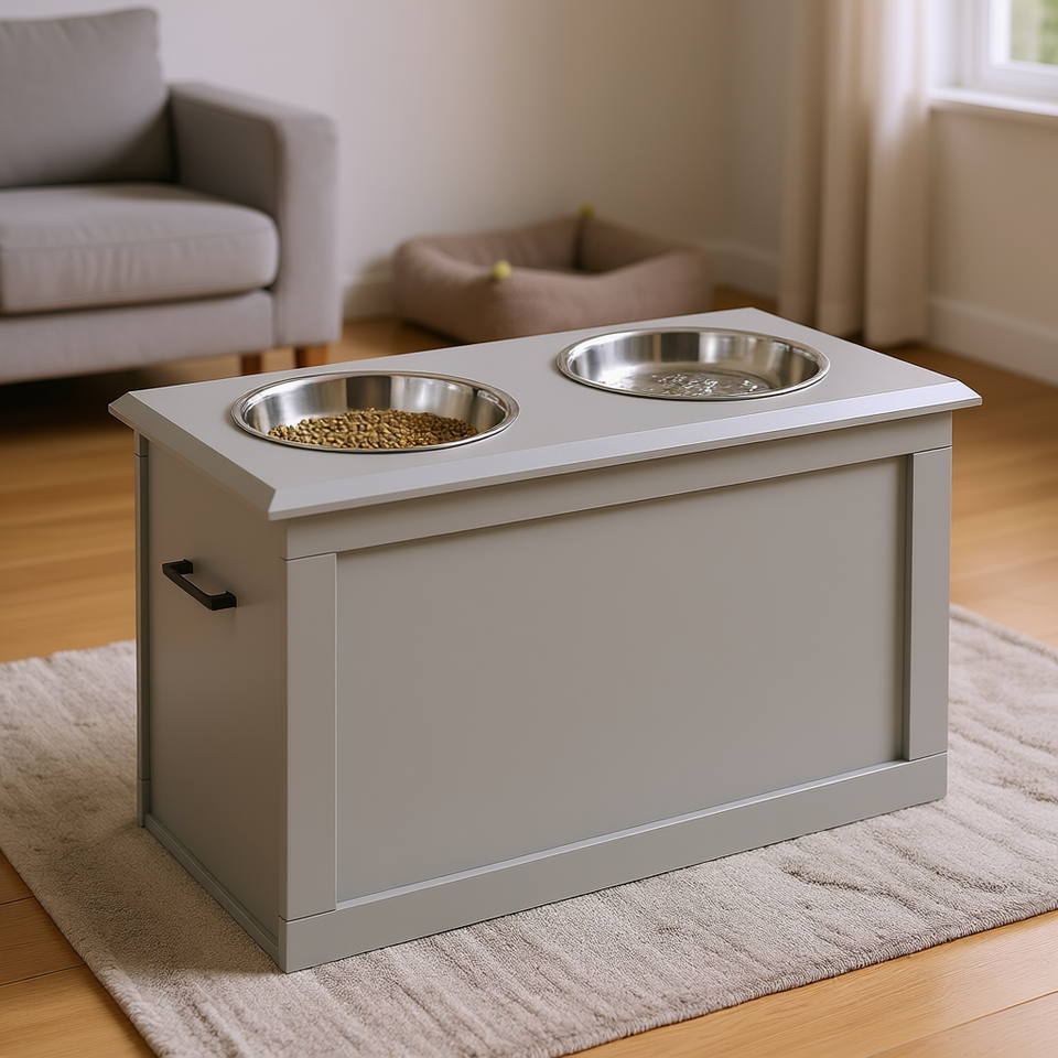 Stazione di Alimentazione Rialzata per Cani Grigia con 2 Ciotole in Acciaio Inossidabile e Vano Portaoggetti per Animali Domestici di Taglia Grande