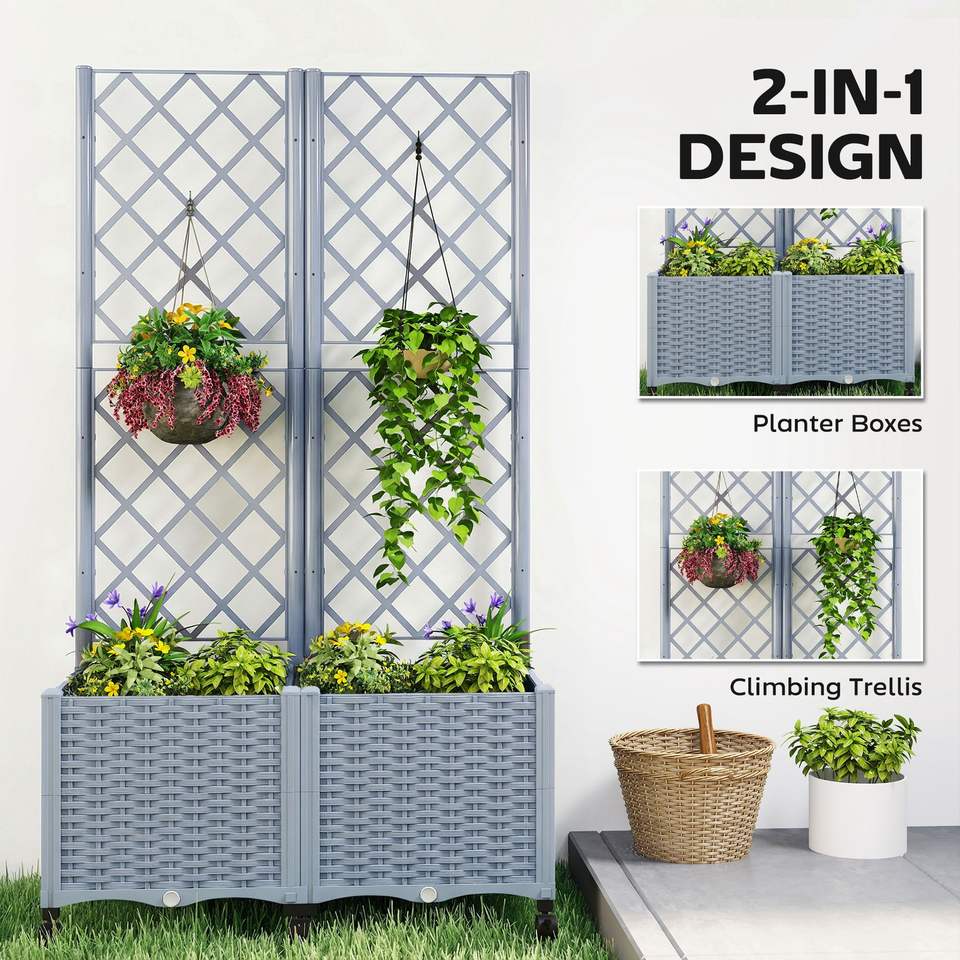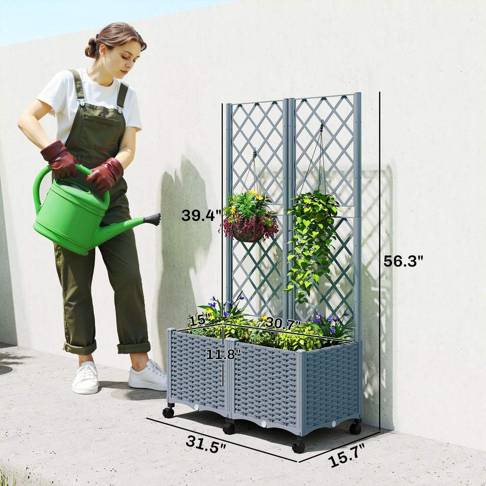 Fioriera Rialzata Autoirrigante Grigia con Traliccio, Ruote Bloccabili e Fori di Drenaggio - Comoda Cassetta per Fiori e Piante