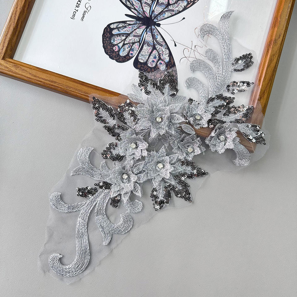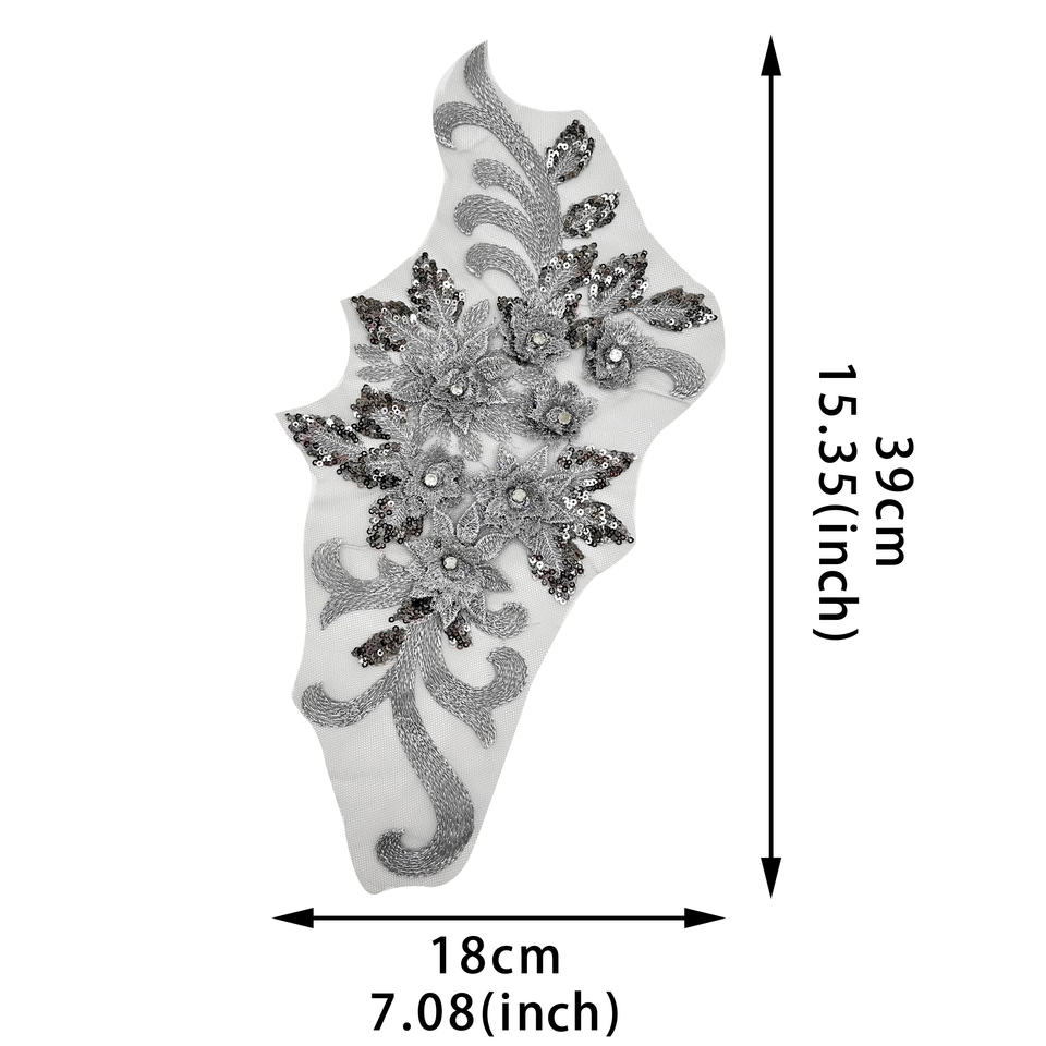 Toppa Applique floreale con paillettes grigie e paillettes per decorazione del vestito motivo monospalla in pizzo per abbigliamento fai da te