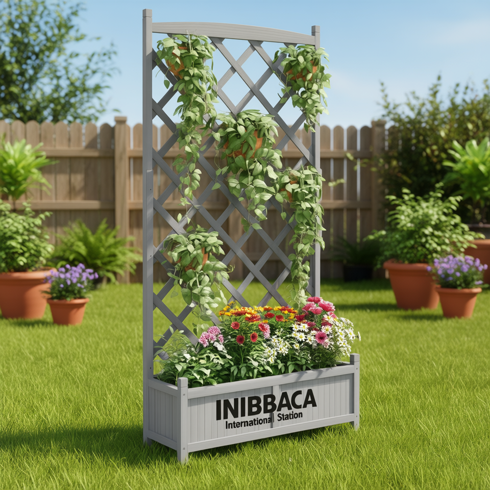 Fioriera in Legno Massello di Abete Grigio con Traliccio e Ruote, Prodotto per Giardinaggio
