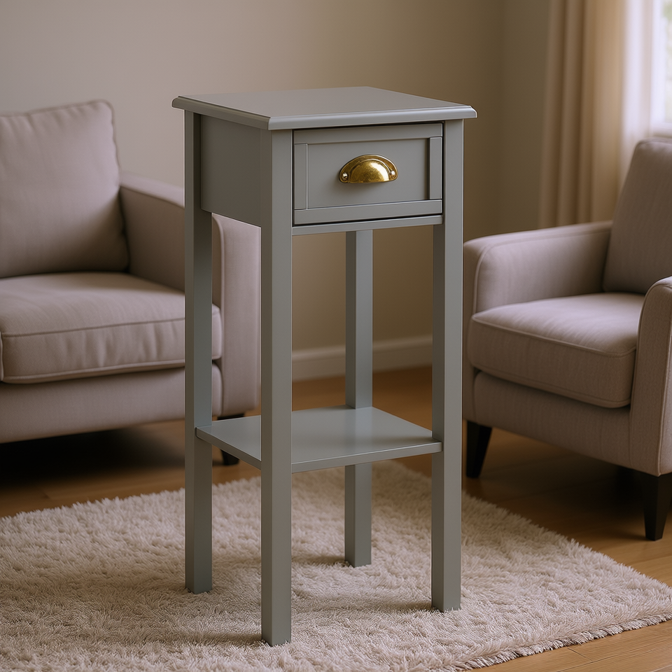 Tavolino alto grigio con cassetto e ripiano, salvaspazio, moderno, per camera da letto e soggiorno