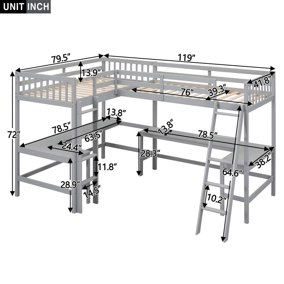 Letto a soppalco a forma di L grigio, singolo, con scaletta e 2 scrivanie integrate per piccoli spazi