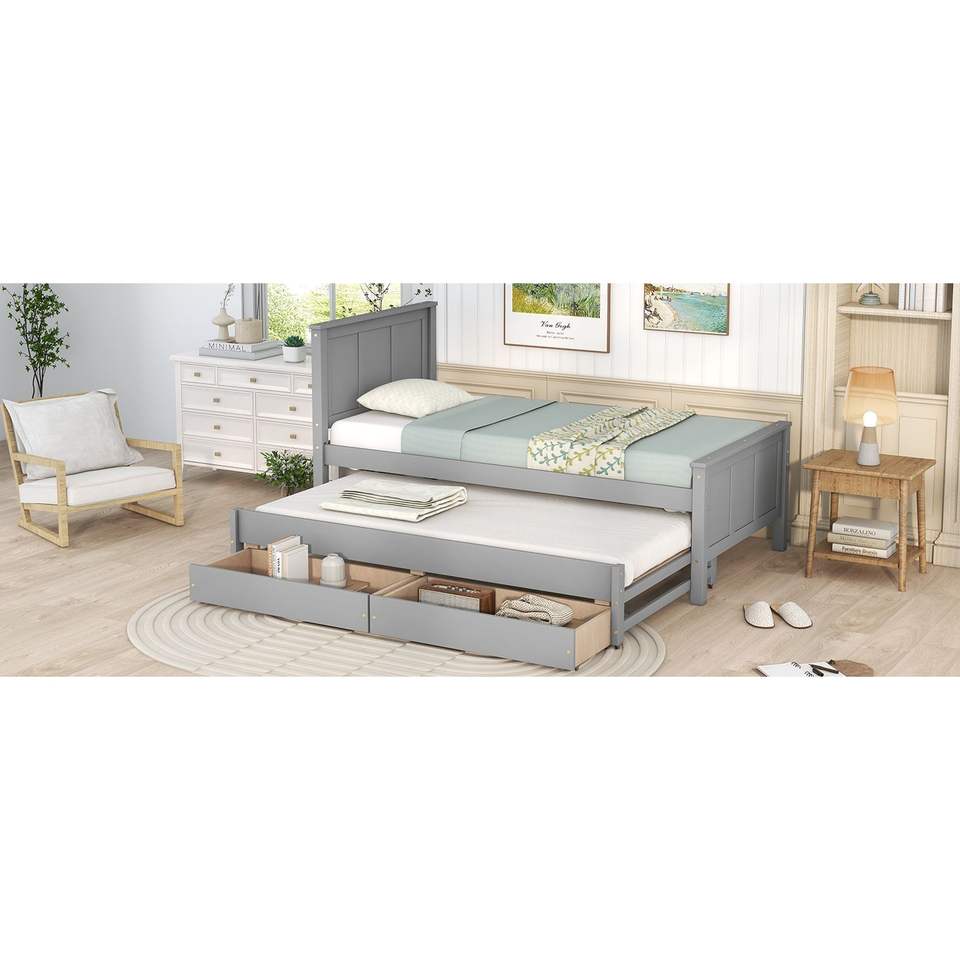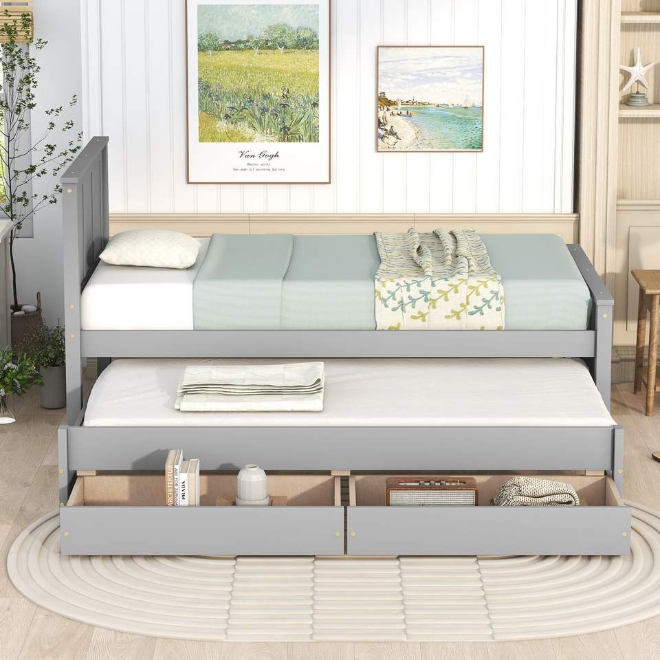Letto a piattaforma grigio matrimoniale con letto estraibile e cassetti