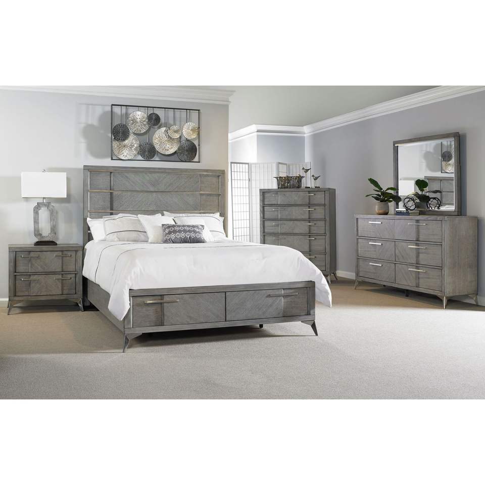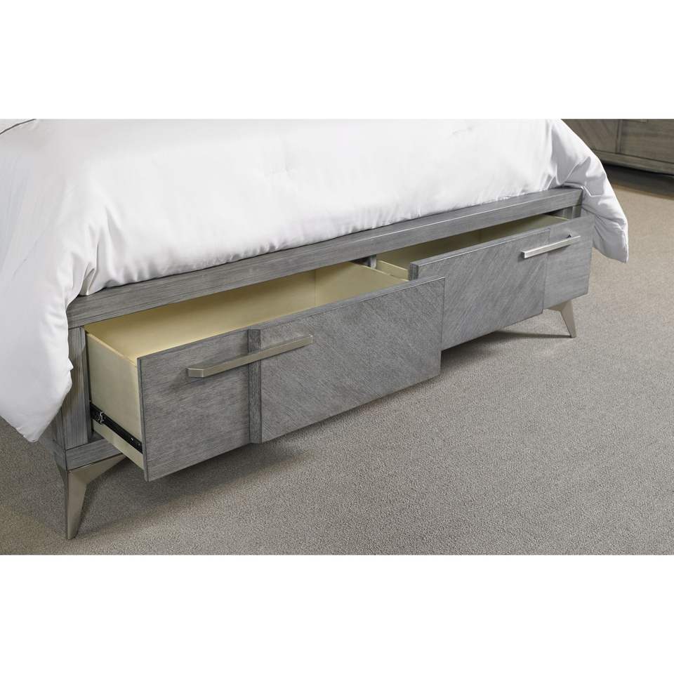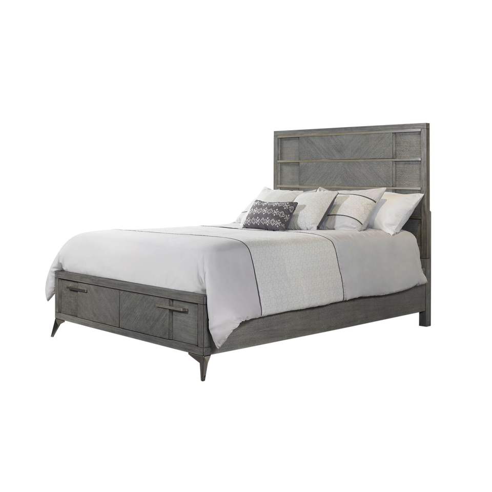 Letto contenitore imbottito grigio con impiallacciatura a venatura naturale