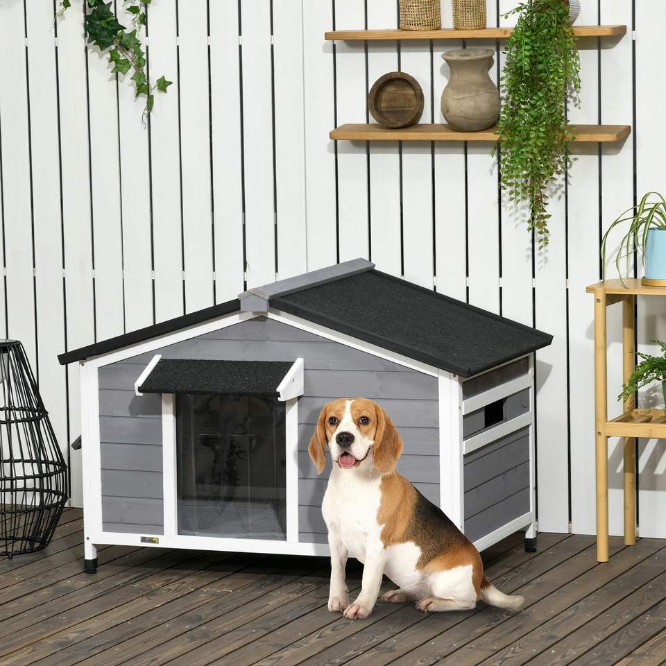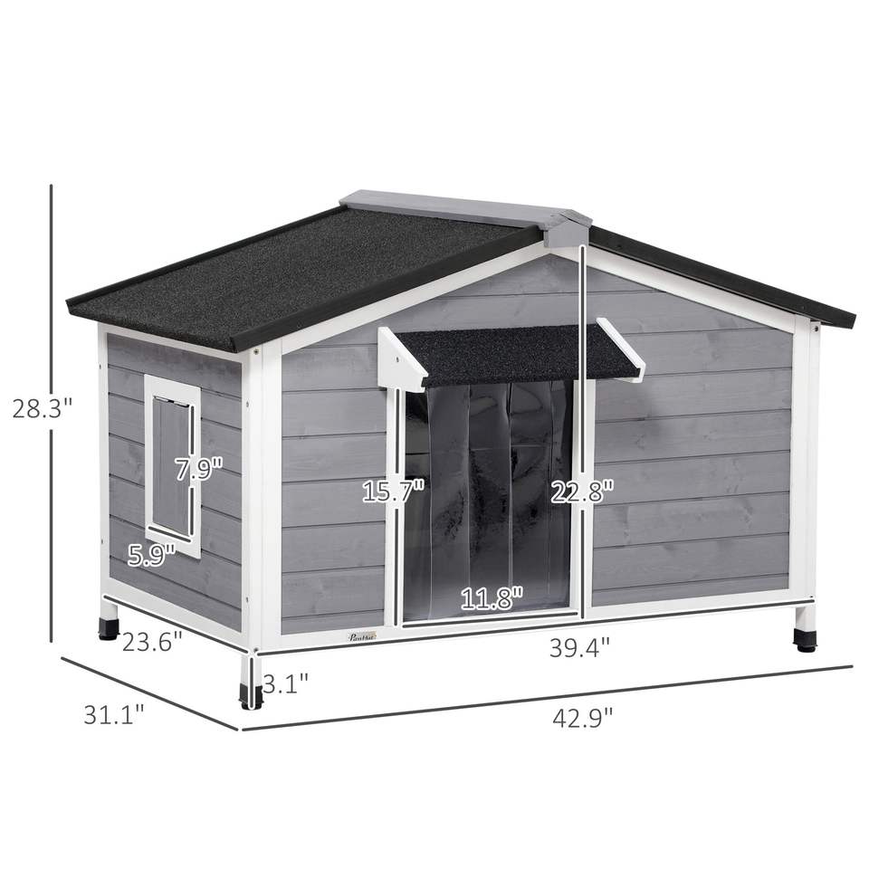 Gray Wooden Cabin-Style Outdoor Dog House with Openable Roof and Removable Bottom Windows Curtain Foot Covers-Pet Furniture